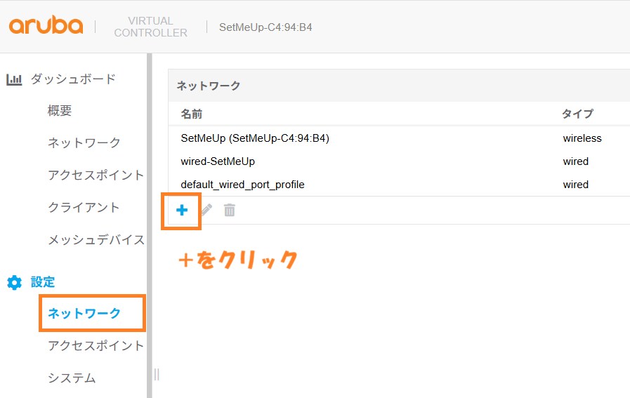 SSIDの設定は「ネットワーク」→「+」ボタンをクリックします。