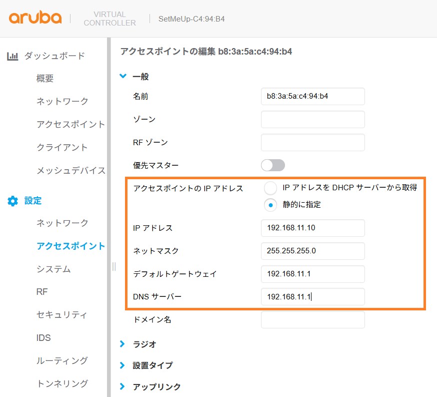アクセスポイントを個別個別するため、IPアドレスを静的に設定します。