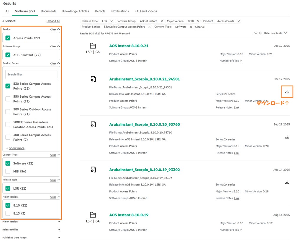 - SoftwareGroup: AOS-8(AOS10はAP単体では動かない仕様のためAOS-8一択です)