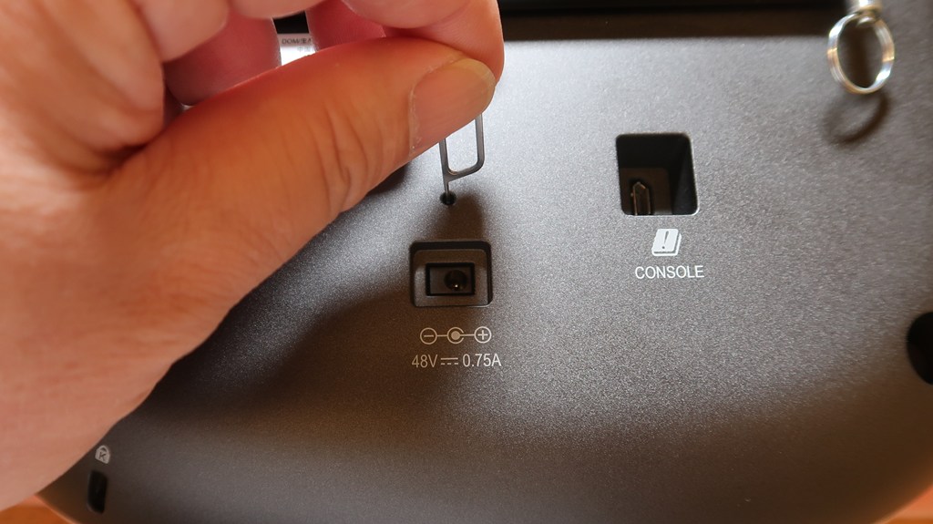 本体リセットは、裏面の初期化ピンボタンを押下しながら電源を入れ、電源ランプが点滅→点灯するまで押し続けることで初期化できます。