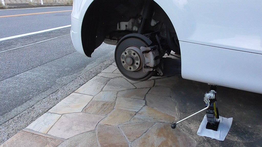 下からアクセスしようにも車載ジャッキでは高さが足りず、人が作業するスペースがありません。