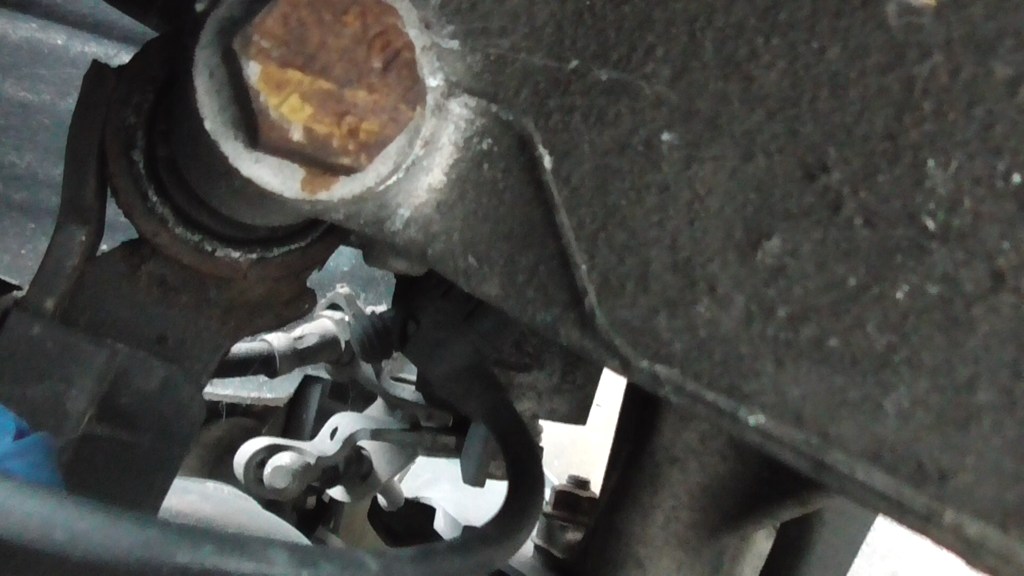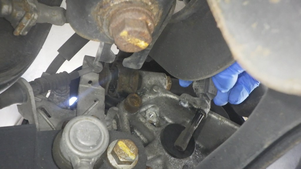 ところが、Audi TTのABSセンサーは車体の内側から止められており、センサーコネクタは見えるのですが、ネジ穴が直視できません。