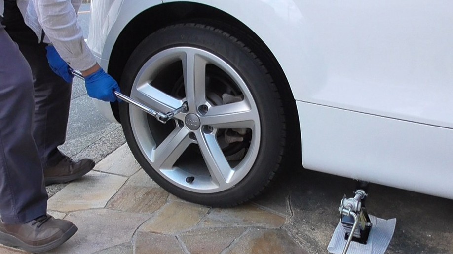 車載ジャッキで右リアタイヤをジャッキアップし、17mmのソケット+エクステンダーでタイヤを外します。