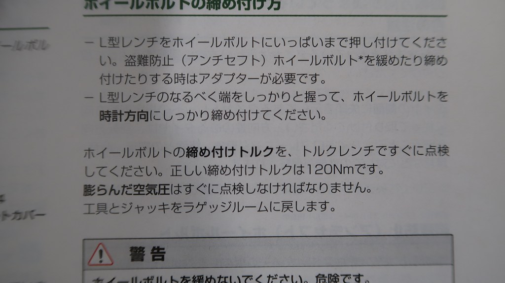 マニュアルでホイールナットの締め付けトルクも確認し、120Nmであることを確認。