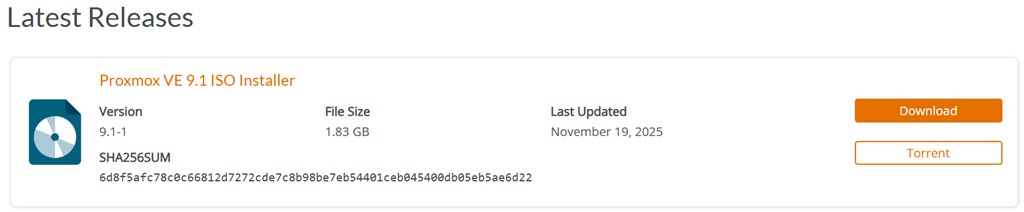 Proxmoxの公式ページから最新のISOファイルをダウンロードします。