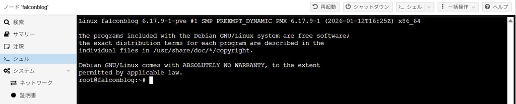 Proxmoxコンソールから[>シェル]を起動し、コマンド操作をします。
