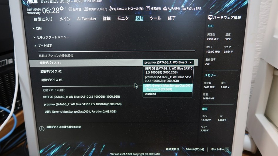 Delキー連打でマザボのUEFI画面に入り、起動デバイスをUSBに設定します。