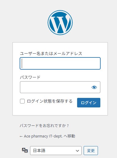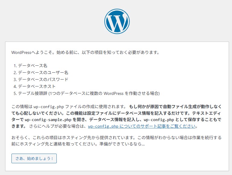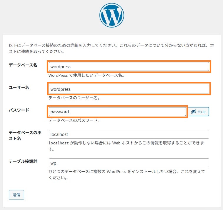 データベースのユーザーアカウントは[4]で設定した、初期ID:wordpress、初期パスワード:password、となります。